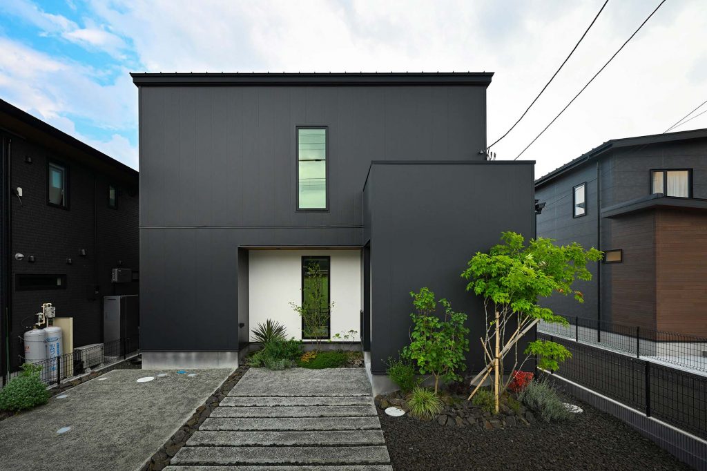黒のガルバリウムと白の塗り壁の組み合わせがスタイリッシュな印象のYさん宅。1階と2階の縦長の窓の並びもお気に入りポイントだそう