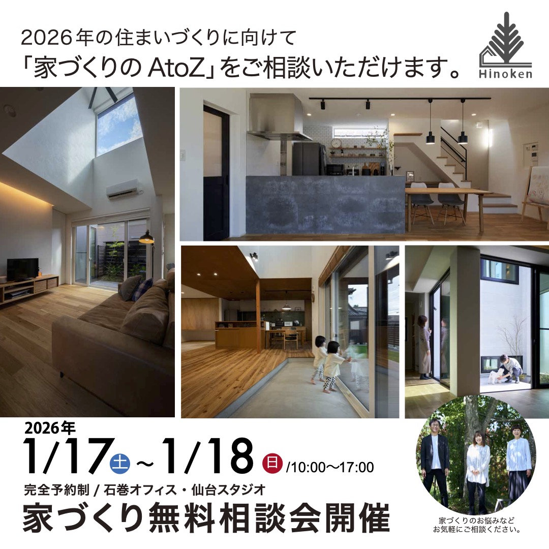 2026年の住まいづくりを考え始める方に向けて、ヒノケンでは、1月17日(土)〜18日(日)の2日間、石巻オフィス・仙台スタジオにて、年明け最初の家づくり無料相談会を開催します。